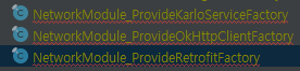 이렇게 @Provide로 지정한 클래스 각각의 Factory가 생성되어 있다. 하나만 살펴보자면... 앞서 살펴본 Factory의 구조와 동일하게 Provider를 통해 필요한 인스턴스(okhttpclient)를 가져와서 생성자에 넣어 인스턴스(retrofit)를 만들고 있다. 다른 부분은 생성자에서 provideRetrofit으로 인스턴스를 생성하는 과정에서 내가 만든 NetworkModule에 접근하여 Retrofit의 인스턴스를 생성하고 있다. 내가 Retrofit의 인스턴스를 만드는 방법을 NetworkModule에 적어놨기 때문이다..
